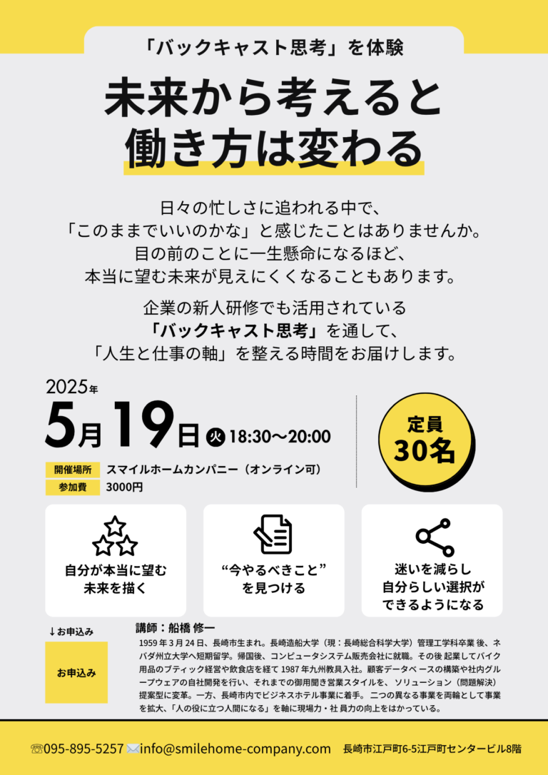 - 2026年04月23日 セミナー このままでいいのか悩む方へ 未来から考える働き方セミナー(バックキャスト思考) 5月19日(火)18:30~20:00